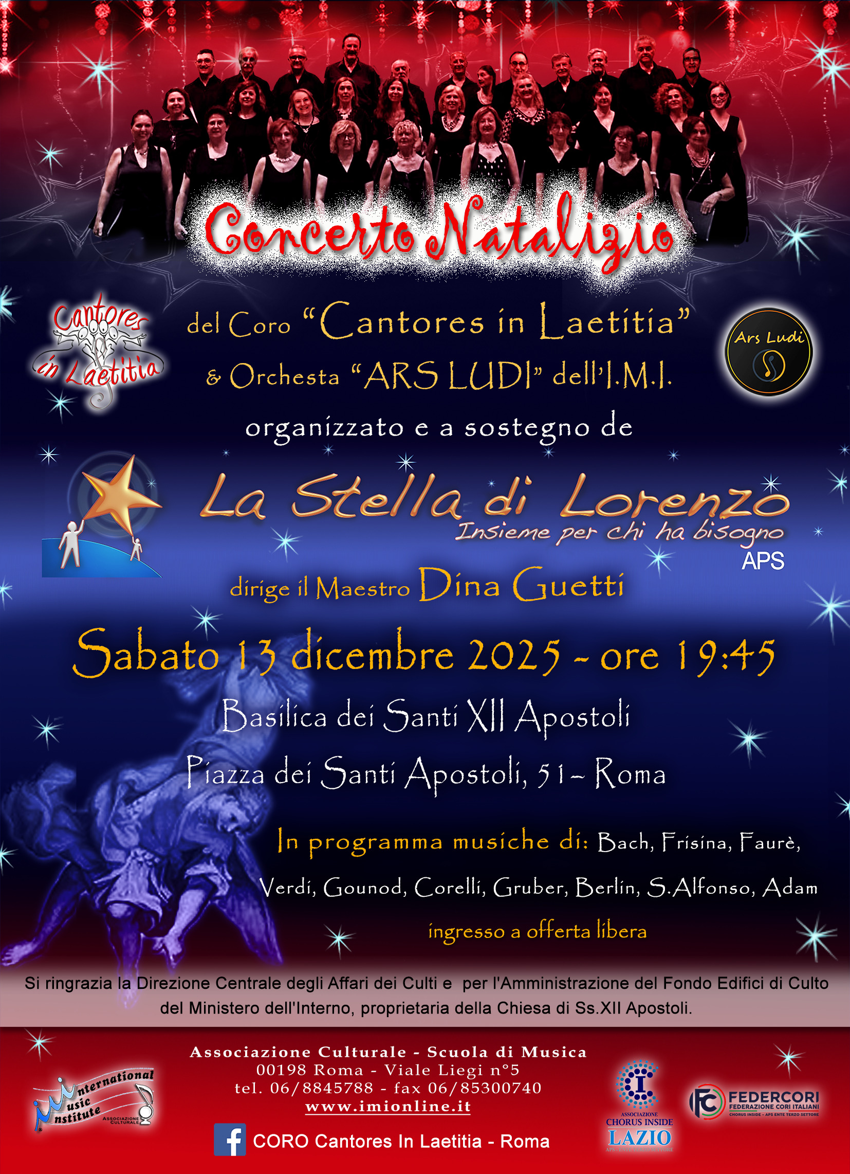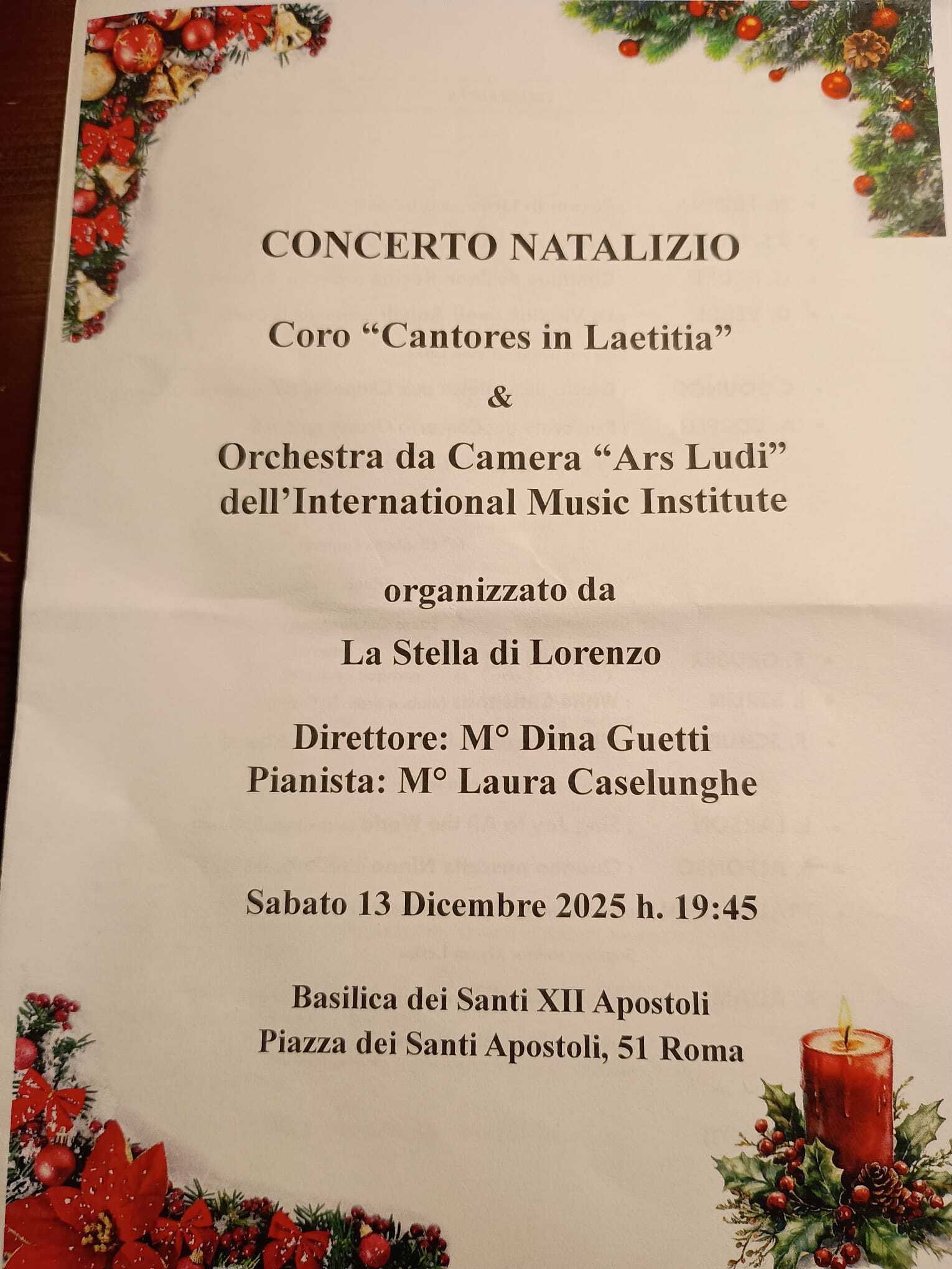 Il sodalizio che vede l'associazione organizzare il tradizionale concerto di Natale con il coro "Cantores in Laetizia" e l'orchestra "Ars Ludi" dell'International Music Institute, diretti dal M° Dina Guetti, si è rinnovato anche quest'anno. Il luogo scelto per offrire ai propri sostenitori e amici un momento di piacevole e applaudita partecipazione alla esibizione degli artisti, è stata la Basilica dei Santi Apostoli. Fra Robert Calleja, dei Frati Minori Conventuali, ha dato il benvenuto ai presenti, narrando le vicende legate alla costruzione della Basilica, luogo in cui si trovano le relique dei Santi Filippo e Giacomo e descrivendone i capolavori artistici.