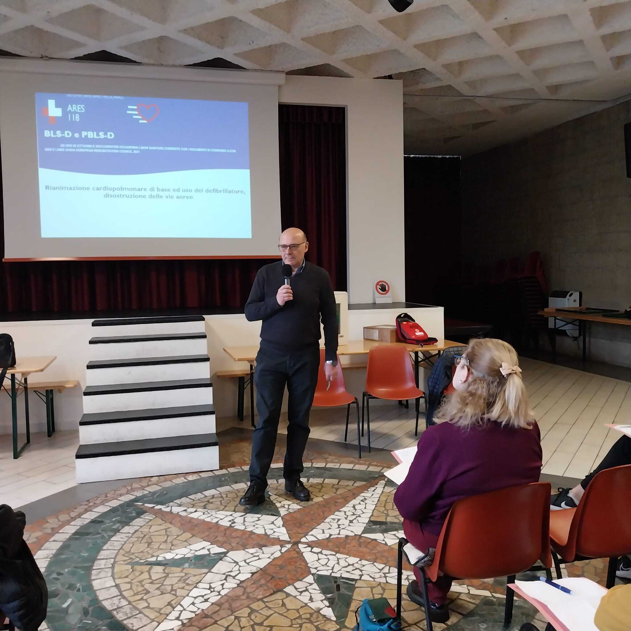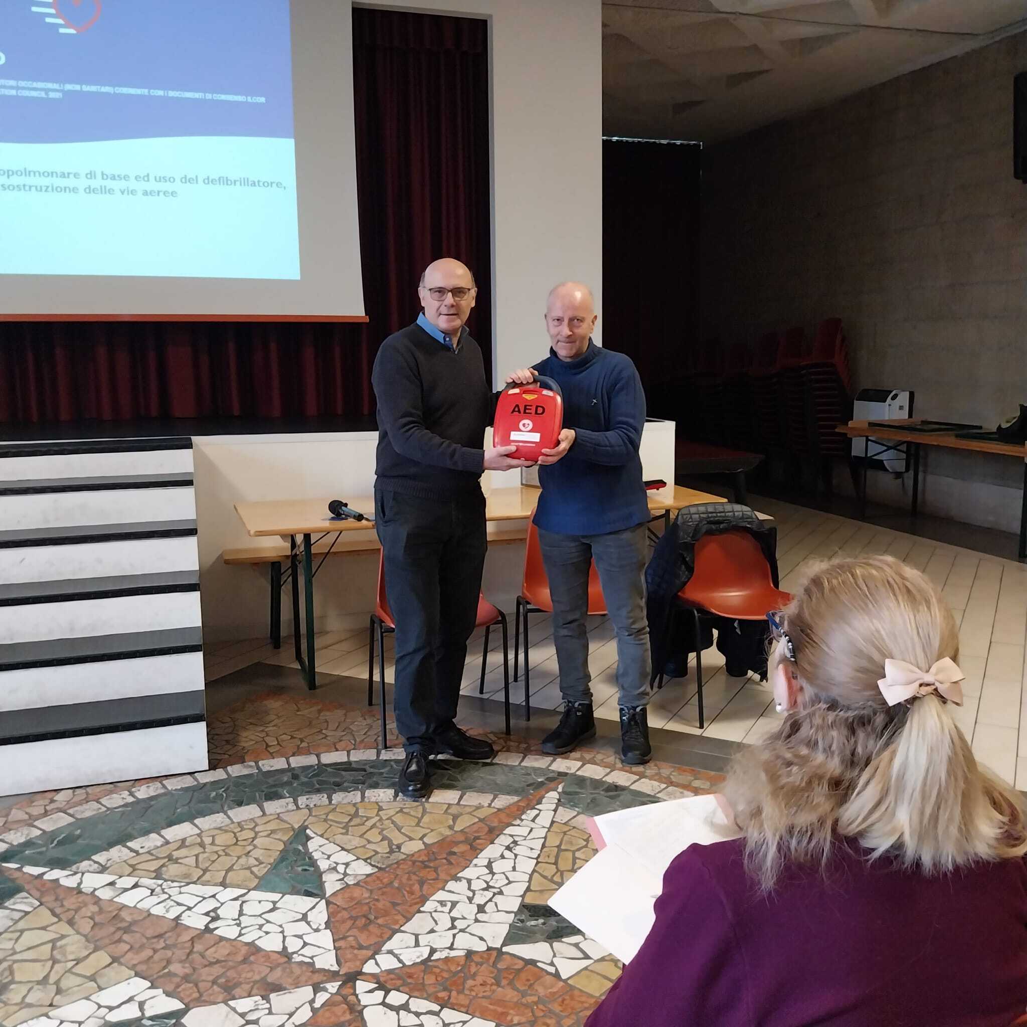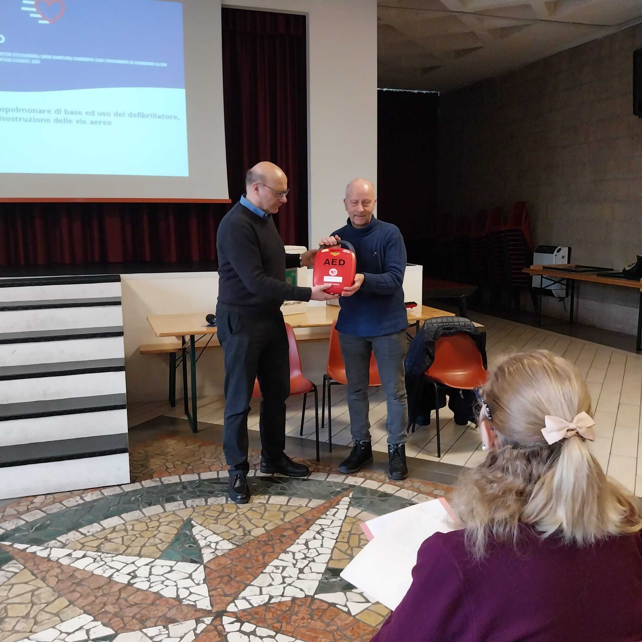 La giornata di formazione è stata preceduta da una breve introduzione del Presidente dell'associazione che, in chiusura del suo intervento, ha donato al parroco Don Fabrizio Biffi un defibrillatore da installare in uno dei locali della parrocchia.